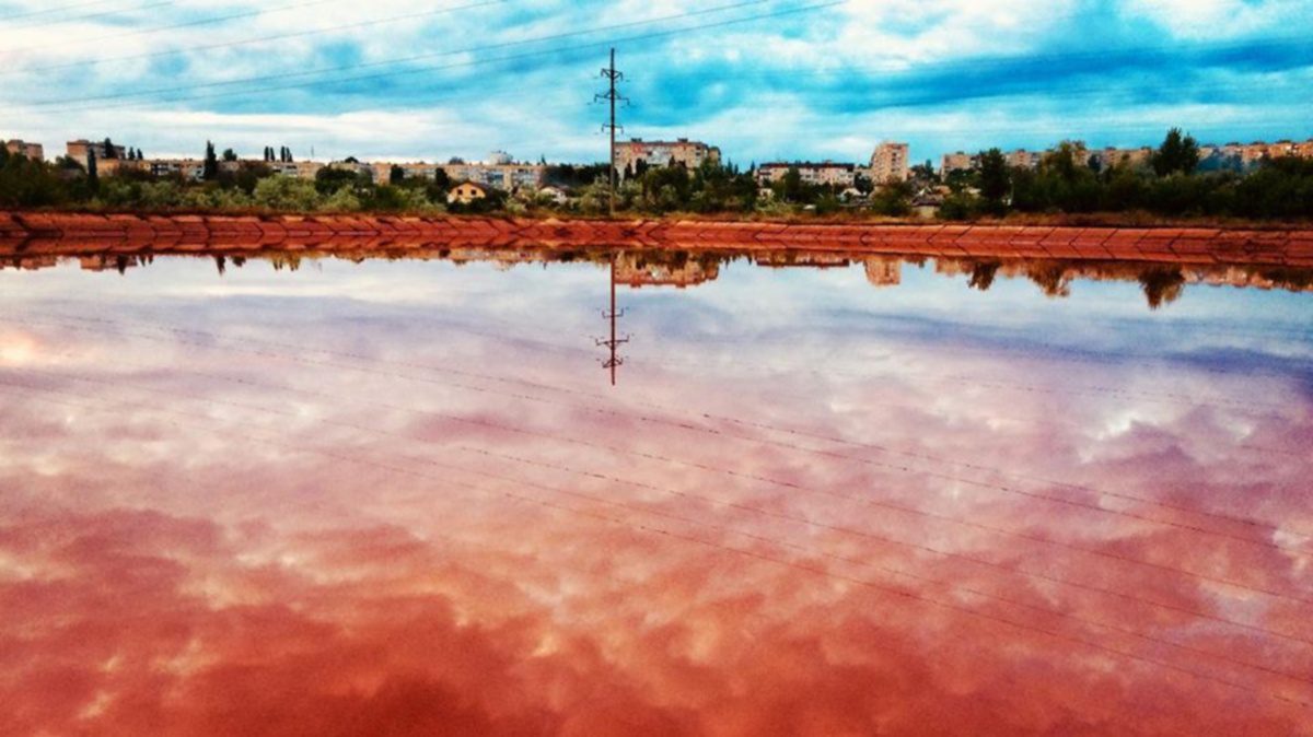 Але у Саксаганському районі це не єдина “червона вода”. Неподалік швейної фабрики розташовані відстійники високомінералізованих шахтних вод. Червоний колір штучного ставка утворився від окисленого заліза. Тому фотографії краще робити на березі такої водойми, тому що пірнати у неї, ми не радимо.