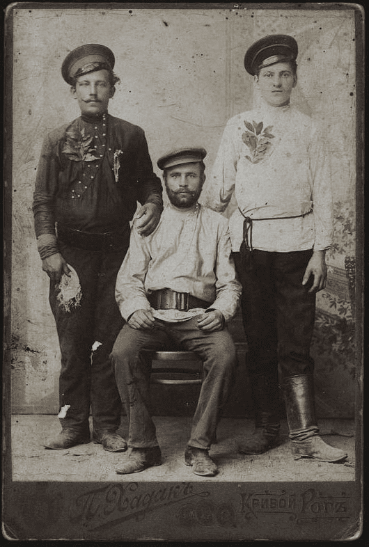 На фотографії Пінхаса Хадака зображено працівника копальні Сергія Колачевського на початку 20 століття. Вони одягнені у звичайні сорочки-косоворотки, які прикрасили гілками із листям.